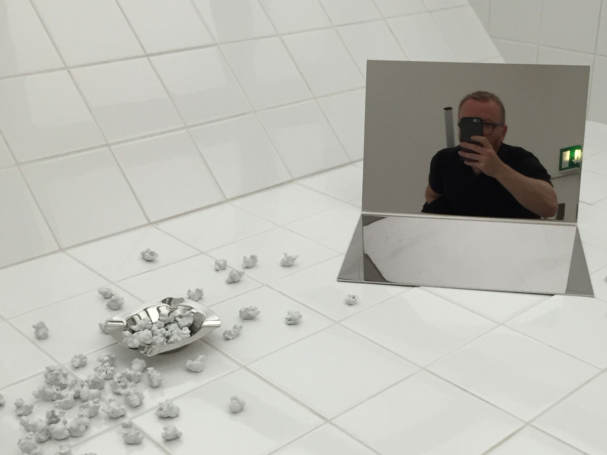 Often, we ourselves become the subjects. Looking For One 2015 (pictured below) focuses on a large structure that sums up both a louche Roche Bobois sofa and the functional, tiled, lounge areas of a gay sauna. Popcorn is strewn across the scene (to me referencing the collective voyeurism of the cinema). But, as if to make it clear that we are all complicit in having used the internet at some point or another to find ‘others’ (whether friends, love, or just sex), Prem includes a polished steel ‘laptop’, so polished in fact, that it reflects your image straight back at you.